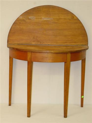 COUNTRY HEPPLEWHITE DEMI LUNE CARD TABLE OF MIXED WOODS W/ A 35 1/2" LID - STRIPPED OF FINISH, LEAF BATTENED, RESTORED, WEAR & IMPERFECTIONS