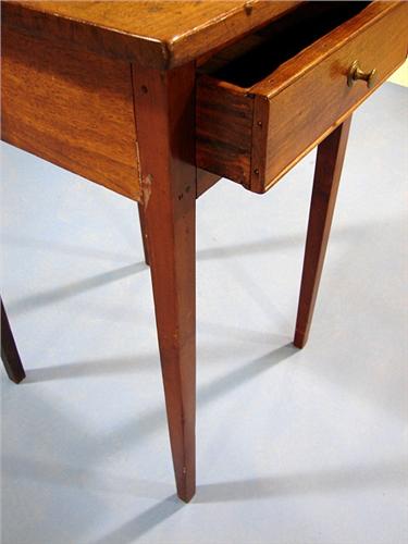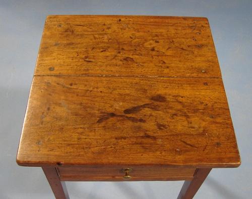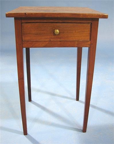 COUNTRY PINE SINGLE DRAWER STAND. Pegged construction. Tapered legs. Two board top. 27” H, Top: 17.5” x 17.25”