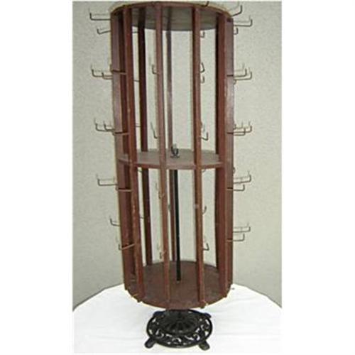 THIS IS A REVOLVING DISPLAY RACK FORM THE TURN OF THE CENTURY. I DON'T KNOW WHAT IT WAS ORIGINALLY USED FOR, MAYBE CARDS OF BUTTONS, COOKIE CUTTERS OR SOMETHING ELSE. TODAY, IT COULD BE USED FOR ANY OF THESE THINGS OR EVEN AS A JEWELRY RACK. THE CONSTRUCTION IS VERY GOOD WITH THE SLATS MORTISED THROUGH THE TOP, BOTTOM AND MIDDLE SHELF. SOME OF THE WIRE HOOKS ARE MISSING AND A FEW NAILS WERE ADDED TO REPLACE SOME OF THEM. THE RACK STANDS A LITTLE CROOKED BUT REVOLVES JUST FINE. IT DATES TO THE LATE 1800 OR EARLY 1900'S.