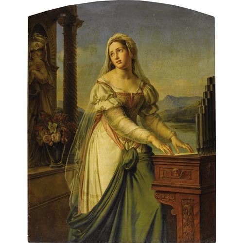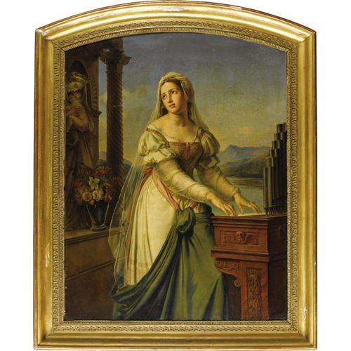 <B>MARIE-PHILIPPE COUPIN DE LA COUPERIE</B></I> (French 1773-1851)<BR><I>Woman At The organ Before A Statue Of The Virgin And Child (Saint Cecilia?)</B></I><BR>Oil on canvas<BR>65 x 51 inches (165.1 x 129.5 cm)<BR>Unsigned<BR><BR>French painter and lithographer Marie-Philippe Coupin de la Couperie was born at Versailles and trained under the celebrated French romantic painter, Girodet. He was employed by the Sèvres porcelain manufactory and, in 1815, was named professor of drawing at the military college of La Fleche, and six months later at the Ecole de Saint-Cyr. In 1832, he received the <I>croix de chevalier</B></I> of the Legion of Honor. He exhibited at the Paris Salon from 1812 to 1833. Paintings by Coupin de la Couperie are in the collections of the Louvre, Paris; the Napoleon Museum, Arenberg; and the Musée national du château, Pau. <BR><BR>This ambitious painting is characteristic of the type of large-scale works with literary or historical themes Coupin de la Couperie produced for his greatest patron, the Duchess de Berry--Marie-<I>Caroline</B></I>-Ferdinande-Louise de Bourbon (1798-1870). She was the eldest daughter of King Francis I of the Two Sicilies and his first wife, Marie-Clementine of Austria, daughter of Emperor Leopold II and the niece of Marie-Antoinette . Thus she was from a generation younger than her husband, Charles Ferdinand, Duke of Berry (1778-1820), the younger son of Charles, Count of Artois, later Charles X of France (1757-1836), whom she married at the age of seventeen in 1816, and with whom she had four children. She was one of the leading collectors and patrons of her day, as well as the owner of important old masters including a Vermeer now in The Frick Collection, New York. Following the collapse of Charles X's government and his cousin Louis-Philippe 's betrayal of a solemn undertaking to sustain the Duchess's son Henri as King, she became the standard bearer for legitimist resistance. Leading the uprising in the Vendée she was captured by Louis-Philippe 's troops and imprisoned. There she was found to be pregnant and this scandalous discovery, although she had actually secretly married the father of the child, Count don Ettore Lucchesi-Palli, in Rome in December 1831, quickly led to the end of royalist resistance. The Duchess of Berry went on to have a number of children by Lucchesi-Palli, whose descendants ultimately inherited much of her splendid collection.<BR><BR>The large-scale dimensions of this work, as well as its arched top, suggest it may have been commissioned as an altarpiece. Indeed, the figure of the well-attired woman seated at the organ is probably intended to represent Saint Cecilia, who is a patron saint of church music, musicians, and singers and is generally portrayed at the organ.<BR><BR><BR><BR><b>Shipping:</b> Requires 3rd Party Shipping (<a target="_blank" href="http://www.heritageauctions.com/common/shipping.php">view shipping information</a>)