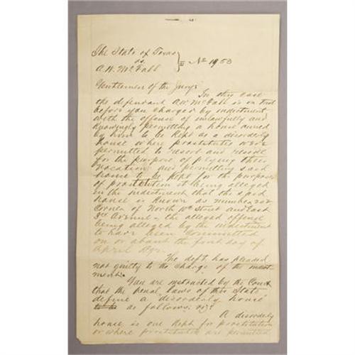<B>COURT DOCUMENT NAVARRO COUNTY TEXAS BROTHEL 1892</B></I> - This document; The state of Texas vs. A. W. McFall, <I>“Gentlemen of the Jury: in the case the defendant A. W. McFall is on trial before you charged by indictment with the offense of unlawfully and knowingly permitting a house owned by him to be kept as a disorderly house where prostitutes were permitted to resort and reside for the purpose of applying there vocation, and permitting said house to be kept for the purpose of prostitution, Etc.” </B></I> Three pages, six pages of the written offense. 8.75' x13.75”Interesting document; <BR><BR><B>Condition: </B></I>very fine condition, except last page slight water damage.<BR><BR><b>Shipping:</b> Flat Material, Small (<a target="_blank" href="http://www.heritageauctions.com/common/shipping.php">view shipping information</a>)