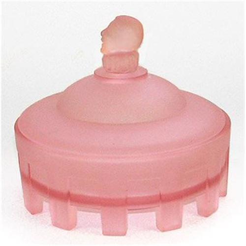 This exquisite satin pink frosted glass figural powder jar is known as COURT JESTER and is shown and described on pages 44-45 in Whitmyer: Bedroom & Bathroom Glassware of the Depression Years. The powder jar lid depicts a Jester's head with ruffled collar atop a rounded lid on a twelve footed base. The jar and its lid measures about 4 1/2 inches tall x 5 1/4 inches across the base, with both in excellent condition.
