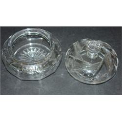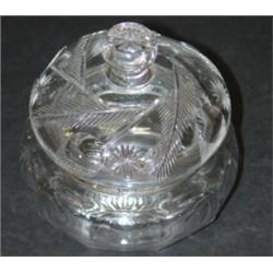 Covered clear glass and etched candy jar. Decorated with leaf and fruit etching on lid. Overall condition is good. 4.5" H, 2.75" Dia.
