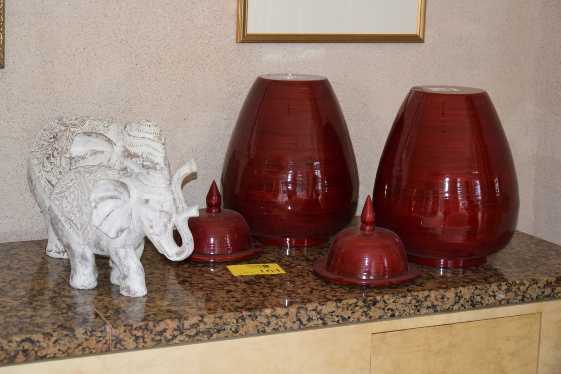 COVERED JARS & DECORATIVE ELEPHANTS (4 PCS)