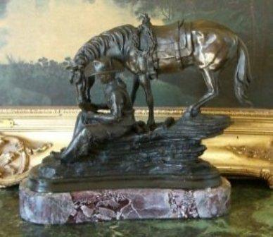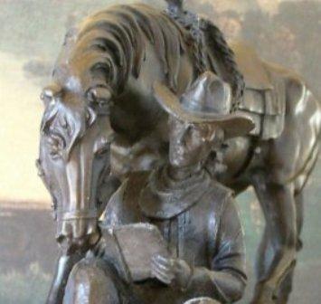 "COWBOY AND HORSE" DAVIS BRONZE SCULPTURE- GREAT DETAIL AND PATINA- APPROX 13HX11WX6D