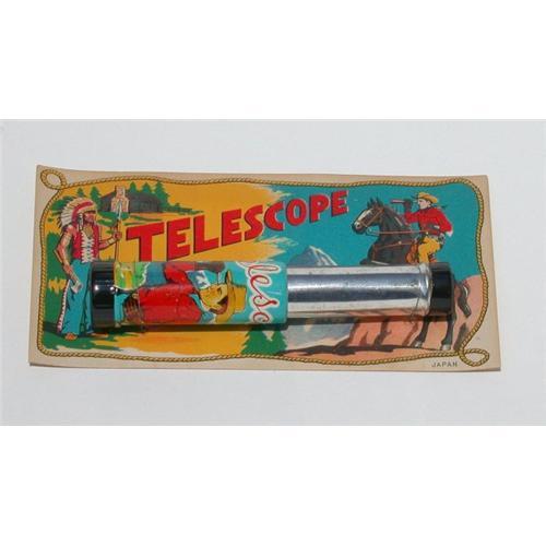 COWBOY & INDIAN TELESCOPE -- c1950, 5? tin litho telescope, on colorful 3? x 6? illustrated cowboy & Indian card