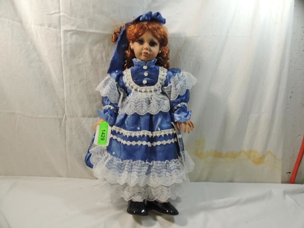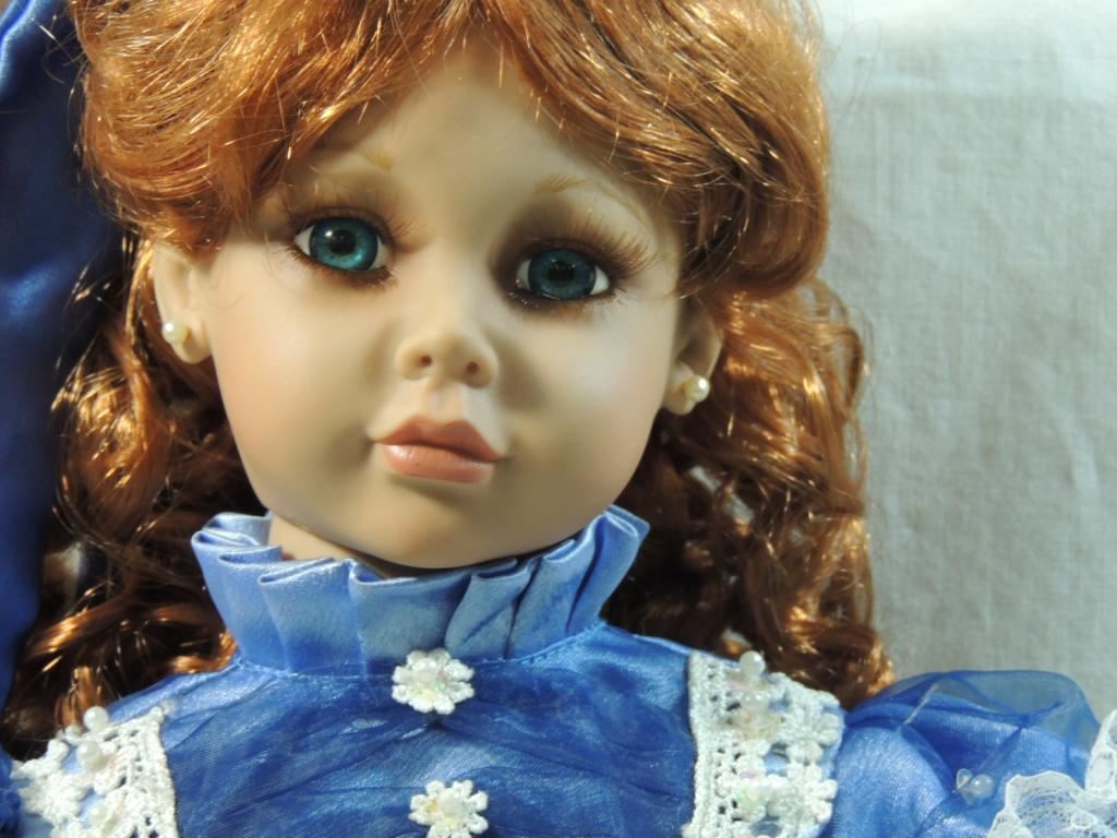 22" VINYL DOLL IN HER FANCY BLUE DRESS ACCENTED WITH LACE. DESIGNED EXCLUSIVELY FOR CRACKER BARREL OLD COUNTRY STORE. GOOD CONDITION COLLECTIBLE AS SHOWN SEE PHOTO FOR MORE DETAILS.