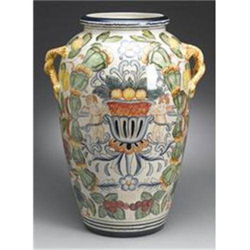 Multi-colored crackle finish porcelain has leafy fruit and cherub design, blue trim at top and bottom, and inside is glazed and has crackle finish. Two faux twisted handles. Dimensions: 28"h, 22"w, 18"d , NEW