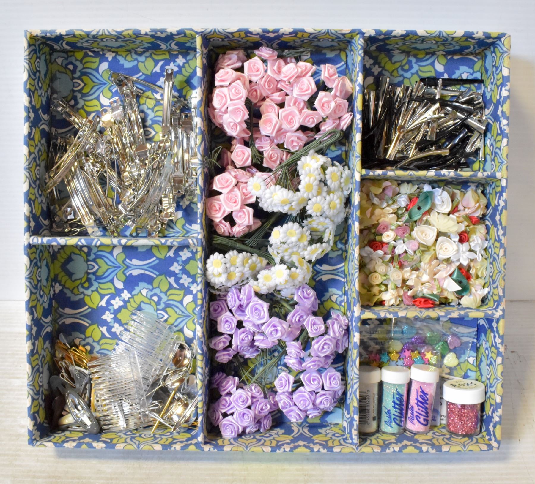 BLANK FRENCH BARRETTES; SNAP CLIPS; ALLIGATOR CLIPS AND BOBBY PINS; RIBBON FLOWERS; ARTIFICIAL FLOWERS; GLITTER;