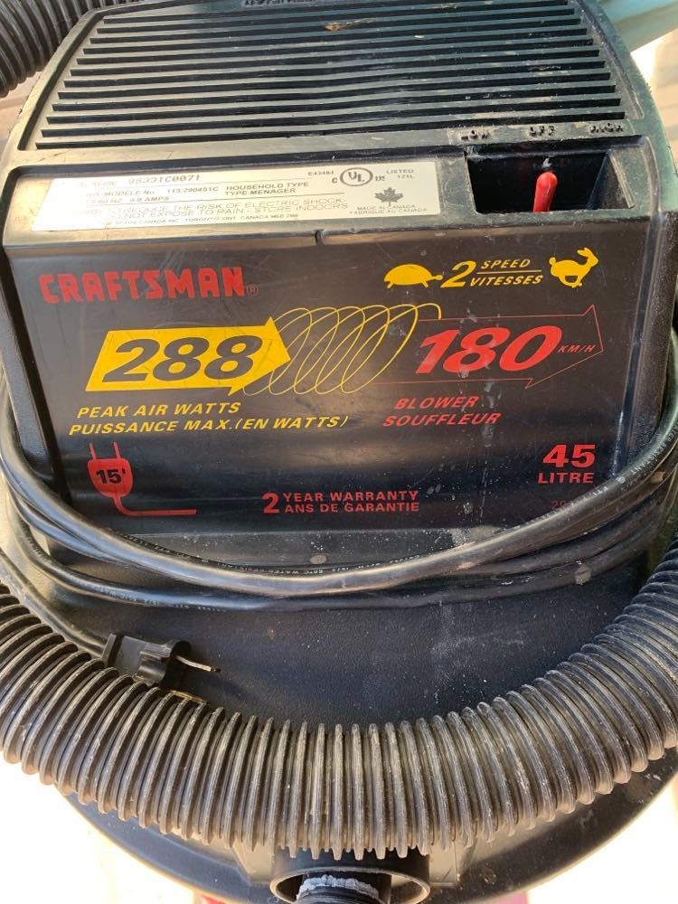 CRAFTMAN 288 SHOP VAC. 180KM/H RBLOWER, 15' CORD INC 2 BAGS. S/N 98331C0071