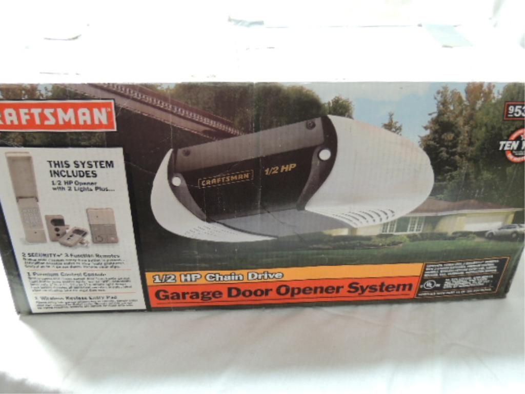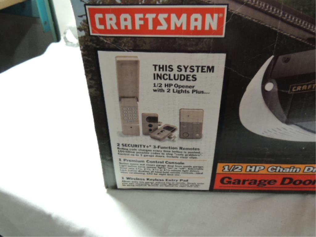 CRAFTSMAN 1/2 HP CHAIN DRIVE GARAGE DOOR OPENER SYSTEM INCLUDES 2 REMOTES, PREMIUM CONTROL CONSOLE, WIRELESS KEYLESS ENTRY PAD. SEE PICTURE FOR DETAILS