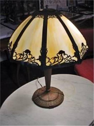 CRAFTSMAN STYLE SLAG GLASS (CARAMEL AND IVORY) TABLE LAMP SIGNED REINAUD #25 WITH FANCY OPEN METALWORK ON THE PANELS. CIRCA 1910 23"X17".