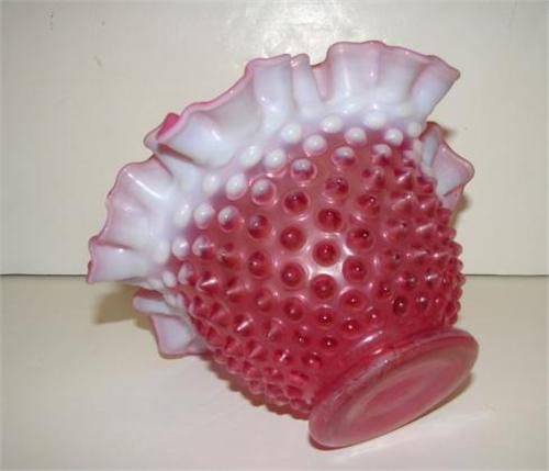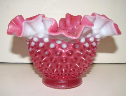 SMALL CRANBERRY OPALESCENT GLASS BOWL. Hobnailed pattern with fluted rim. 4” H