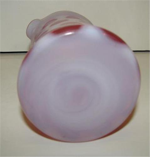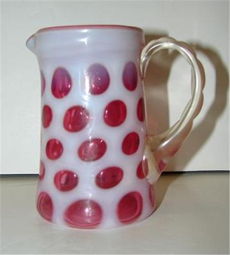 CRANBERRY OPALESCENT GLASS CREAMER. Coin-dot pattern with applied clear glass handle. 4” H