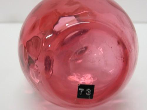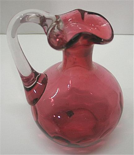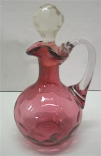 CRANBERRY GLASS VINEGAR CRUET. Fluted top. Thumbprint decoration around body. Applied clear glass handle. Clear glass stopper with prism top does not appear to match. Surface scratching at interior top of body. 7” H