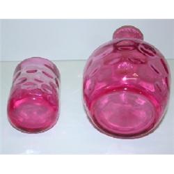 CRANBERRY GLASS DECANTER & TUMBLER. Thumbprint decorated. Excellent condition. 8” H
