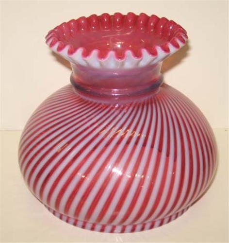 CRANBERRY & OPALESCENT GLASS LAMP SHADE. Ruffled top. 6.75” Dia. at bottom.