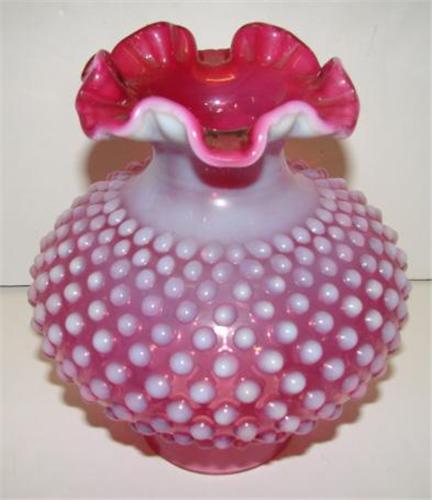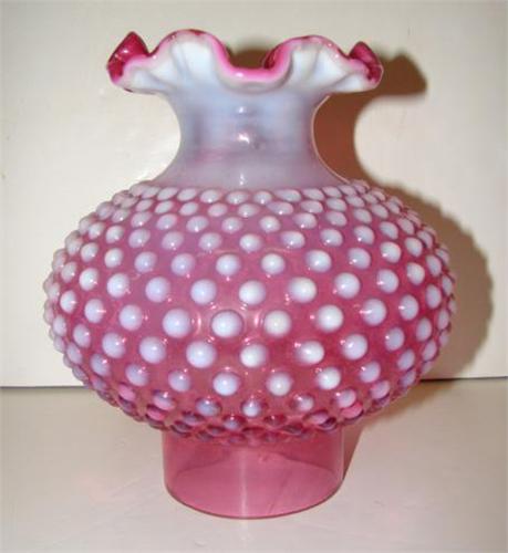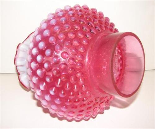 CRANBERRY OPALESCENT GLASS LAMP SHADE. Hobnailed pattern with fluted top. 7” H