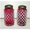 PAIR OF CRANBERRY OPALESCENT GLASS SHAKERS. Hobnailed pattern with silverplate tops. 3.25” H