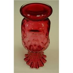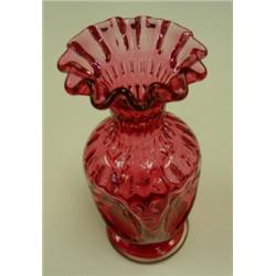 Cranberry Glass vase. Maybe Fenton? Ruffled rim, concave sides with small inverted thumbprint form. Round foot. 7" tall. Condition: Excellent