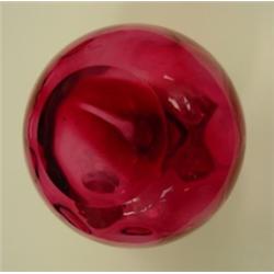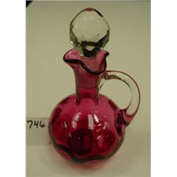 Cranberry Inverted Thumbprint cruet with clear handle and faceted stopper. Polished base. 5" tall without stopper, 6.75" tall with. Condition: Excellent