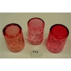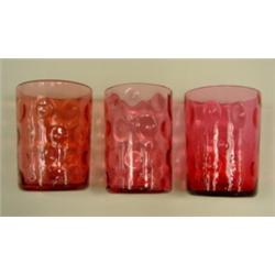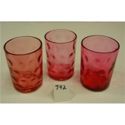Cranberry Inverted Thumbprint tumblers. Set of 3. Molded. Mis-matched, but all 4" tall. Two are 3" in diameter, one is 2-5/8". Condition: Some imperfections, but no damage such as chips, cracks or flakes.