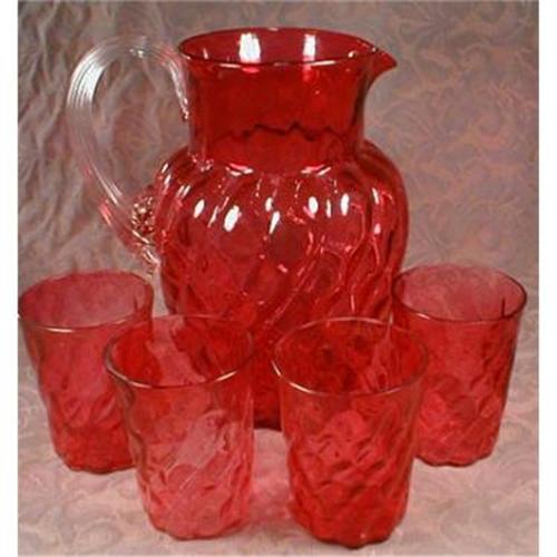 Beautiful swirled cranbrerry glass pitcher with 4 matching