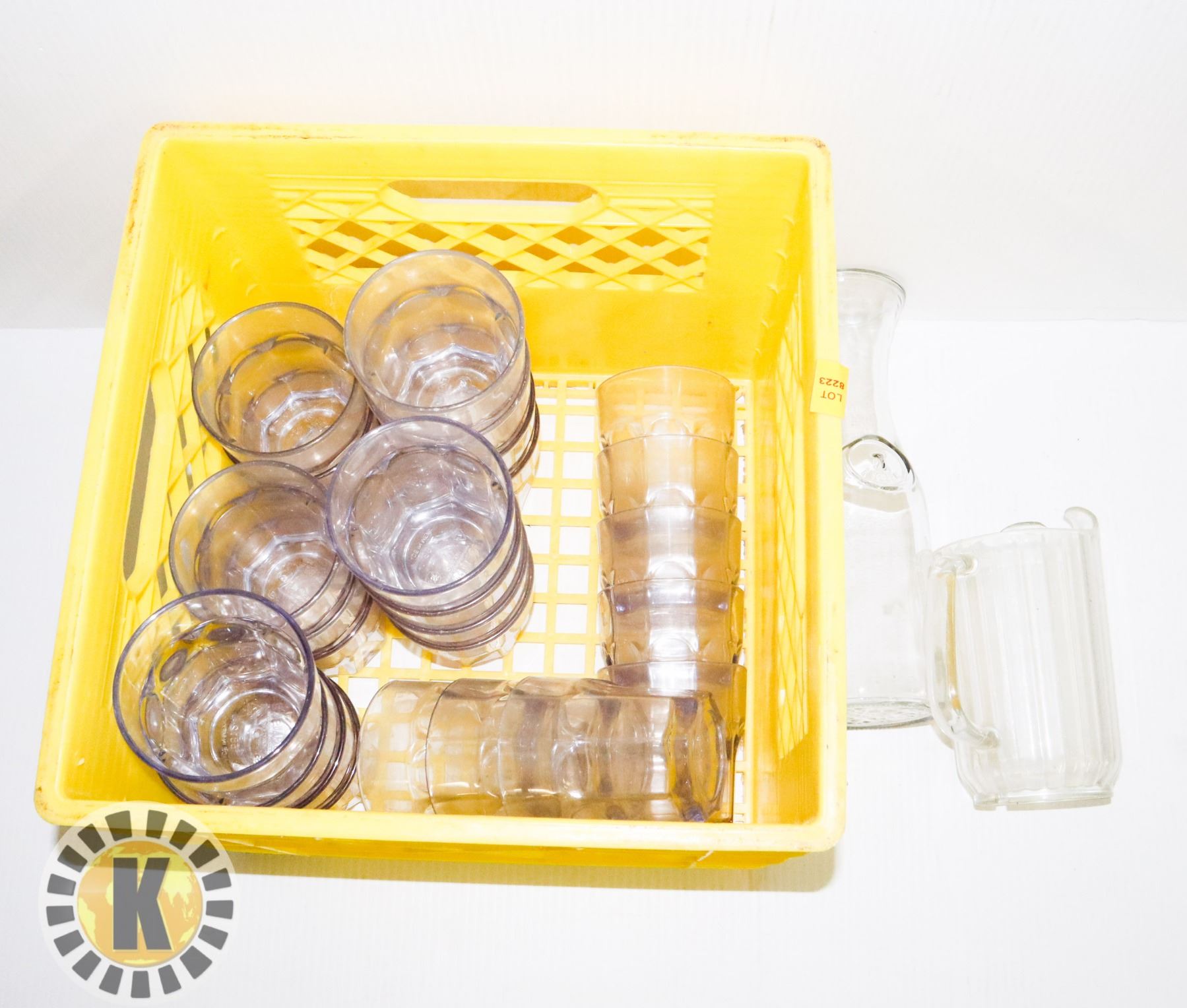 CRATE FULL OF RESTAURANT CUPS, SMALL PITCHER,