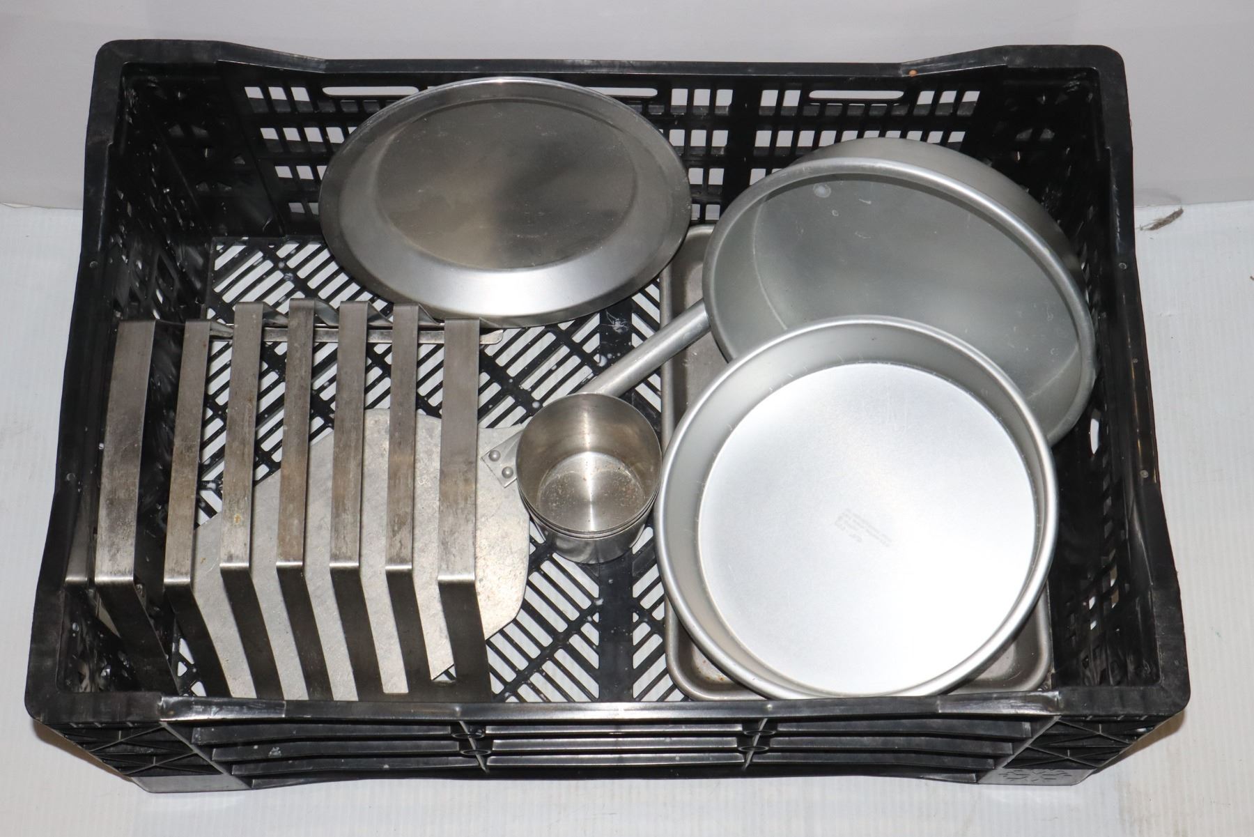 CRATE OF ASSORTED PANS, FLIPPER, AND MORE