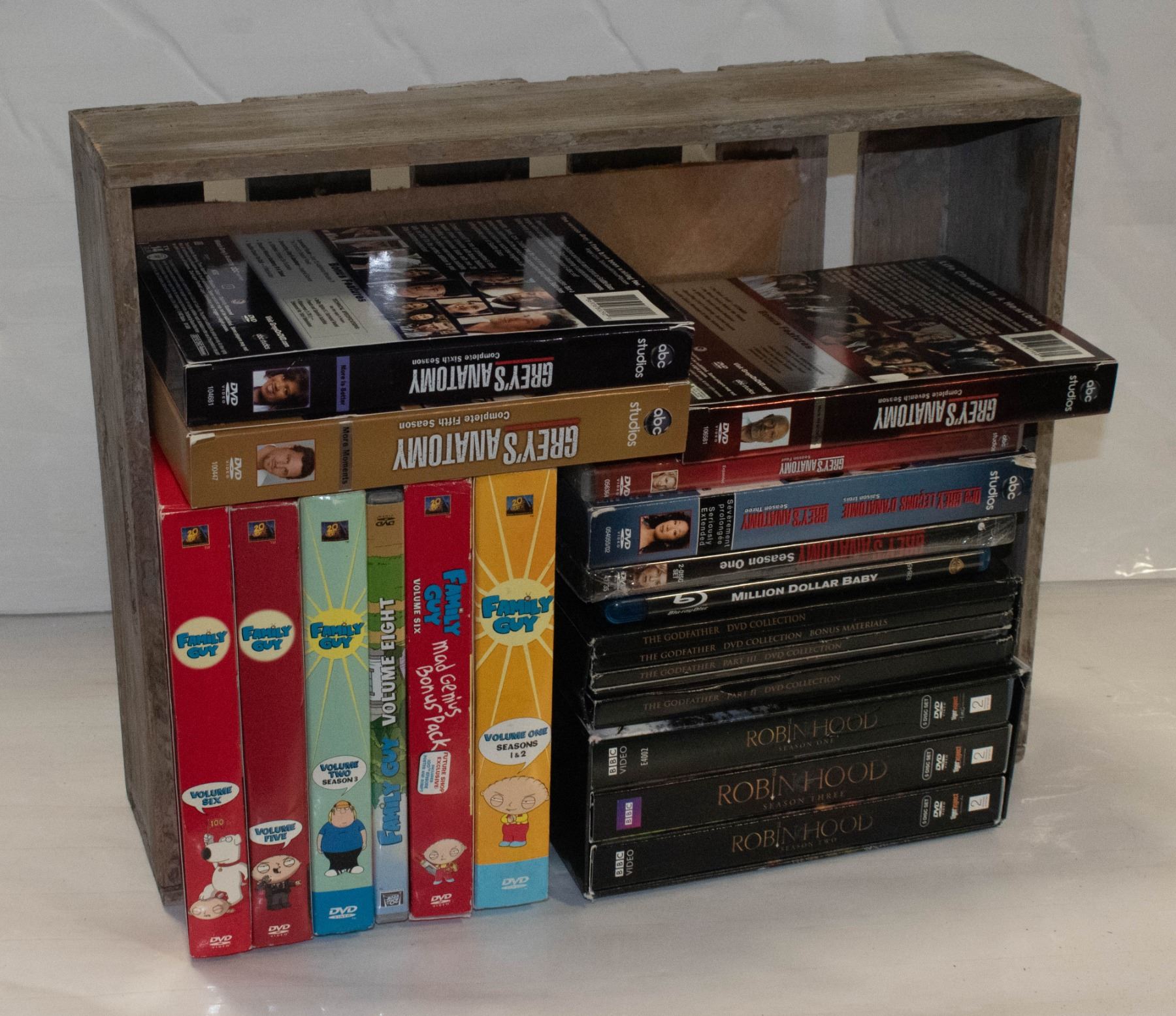 CRATE OF DVDS MOSTLY SEASONS OF FAMILY GUY, GREYS