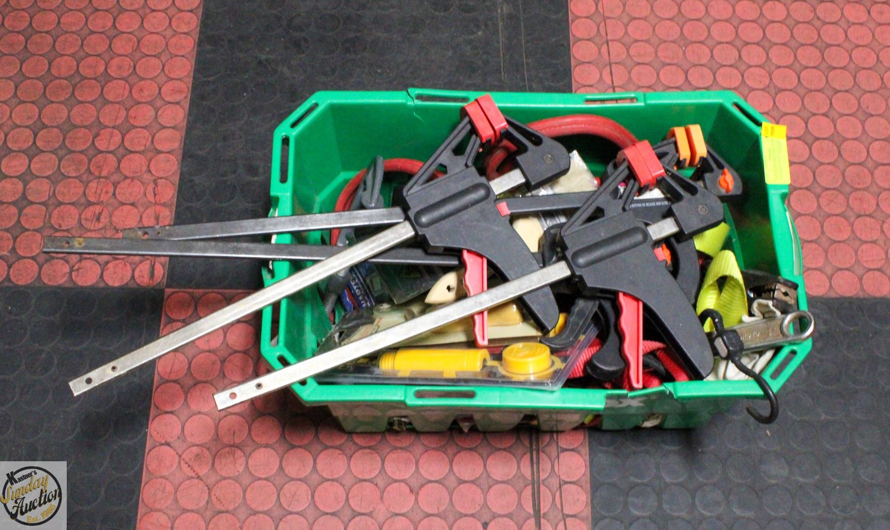 CRATE OF FURNITURE CLAMPS, RATCHET STRAPS AND MORE