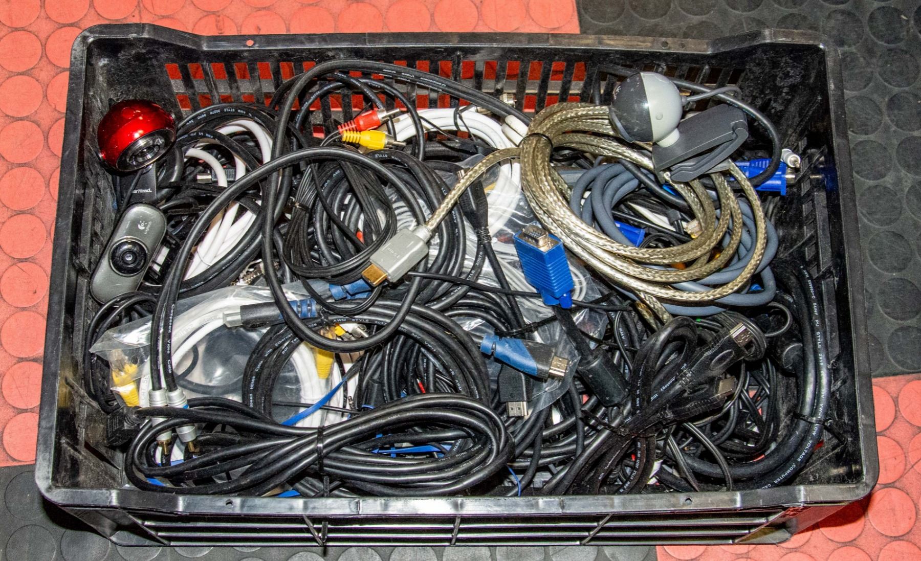 CRATE OF HDMI, RCA, VIDEO CABLES WITH THREE WEB