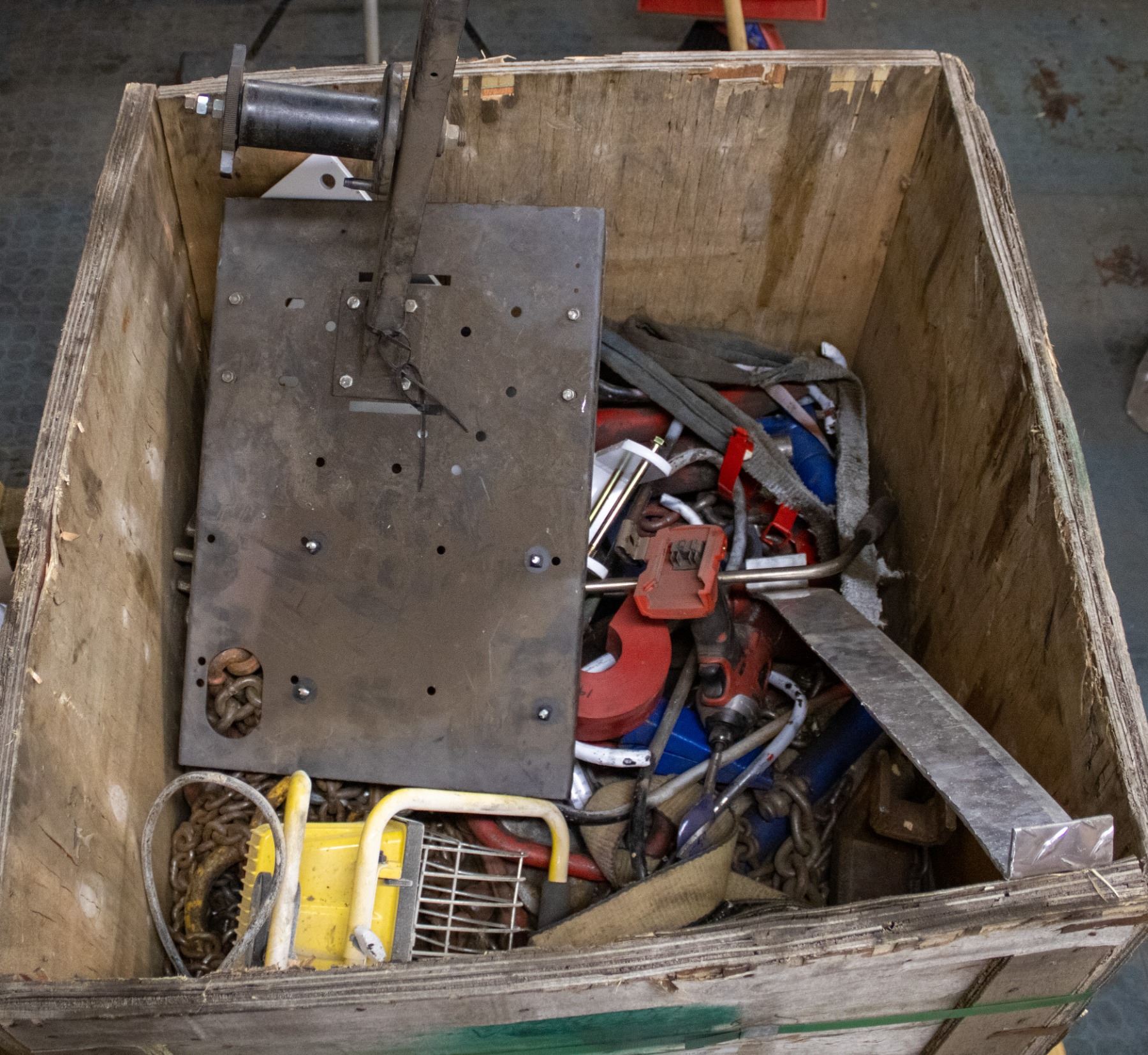 CRATE PALLET OF ASSORTED INDUSTRIAL TOOLS, CHAINS