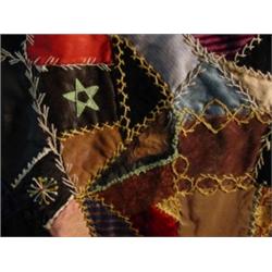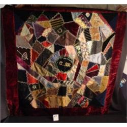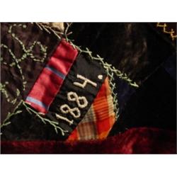 28 1/2" Sampler Square Crazy quilt, initials and date 1884 embroidered into fabric. Also has embroidered wheels, umbrella, star and horseshoe. It is pieced together with fancy feather stitches and trimmed with wine colored velvet. Initials are CM & AH.