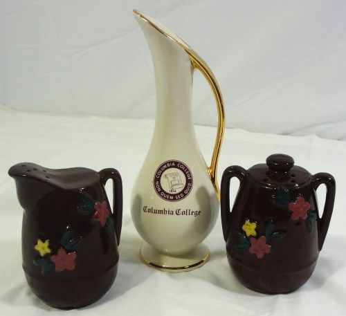 CREAM AND SUGAR SALT AND PEPPER SHAKERS AND COLUMBIA COLLEGE COLLECTIBLE EWER