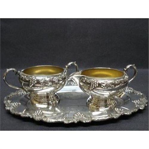 BEAUTIFUL ANTIQUE 3 PIECE SET, CONSISTING FROM LOVELY OVAL TRAY, CREAM JUG AND OPEN SUGAR, IT COMES IN GORGEOUS AND MOST POPULAR PATTERN DEPICTING RAISED GRAPES AND LEAVES, WITH FINE DETAIL,SIGNED: OLD ENGLISH REPRODUCTIONEPNS ON COPPER - L251 - 45.IT IS SILVER PLATED AND SILVER IS VERY MUCH STRONG, NO "BOLD" SPOTS, EXCELLENT CONDITION NO DENTS OR RUST, cream and sugar stands about 2 3/4" high and tray about 10 1/4" x 7 1/2" - US Buyer to pay 9.00 for shipping plus insurance,THANKS.