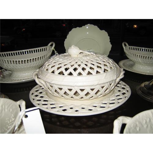 LEEDSWARE FINE BASKETWEAVE CREAMWARE TUREEN WITH TWISTED HANDLES AND A BEAUTIFUL ACORN FINIAL. IT COMES COMPLETE WITH THE ORIGINAL BASKETWEAVE EDGED UNDERPLATE. IT IS VERY GOOD CONDITION APART FROM SOME VERY FINE CRAZING ON THE UNDERPLATE - TYPICAL FOR ITS AGE. THE WEDGWOOD FACTORY PRODUCING LEEDSWARE ONLY PRODUCED FOR A SHORT PERIOD OF TIME AS IT WAS NOT FINANCIALLY VIABLE. WHEN IT CLOSED ALL THE MOULDS WERE DISTROYED. BOTHE THE TUREEN AND THE UNDERPLATE HAVE THE IMPRESSED 'LEEDSWARE' MARK.