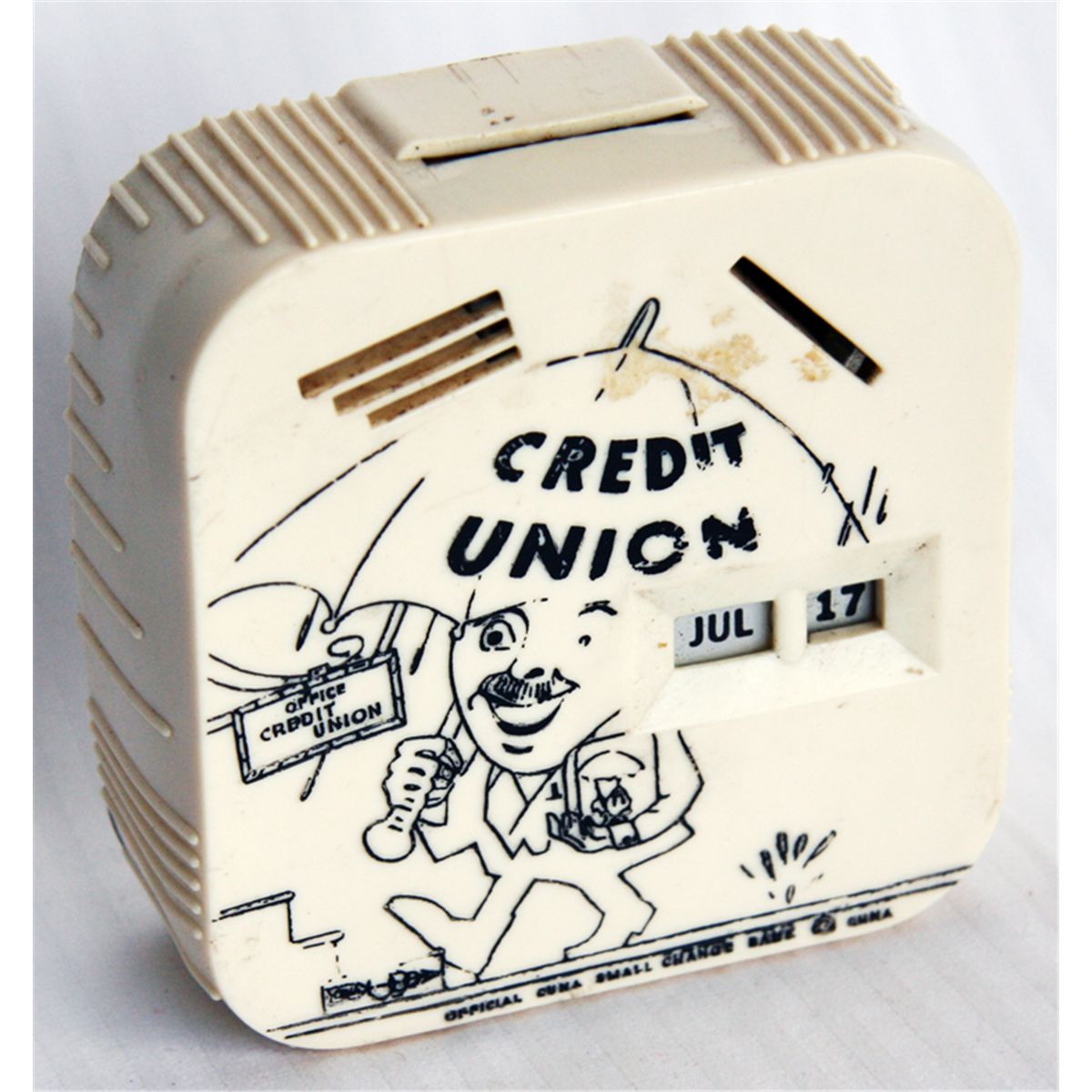 CREDIT UNION-A COIN CALLEDAR BANK. A rectangular Coin Calendar bank. Coin slots on top and front for five different denominations. 10cm x 10cm x 2 1/2cm. Cream coloured plastic. Day/Date counter on front. Maker-M.A. Gerett Corp., Milwaukee, USA. VF.