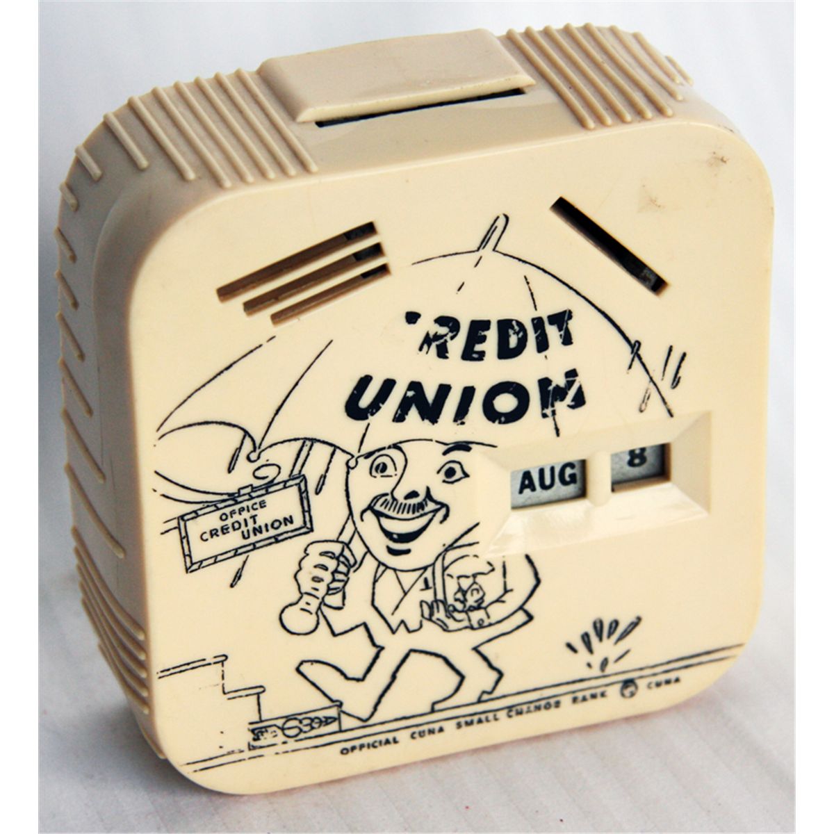 CREDIT UNION-A COIN CALLEDAR BANK. A rectangular Coin Calendar bank. Coin slots on top and front for five different denominations. 10cm x 10cm x 2 1/2cm. Cream coloured plastic. Day/Date counter on front. Maker-M.A. Gerett Corp., Milwaukee, USA. VF.