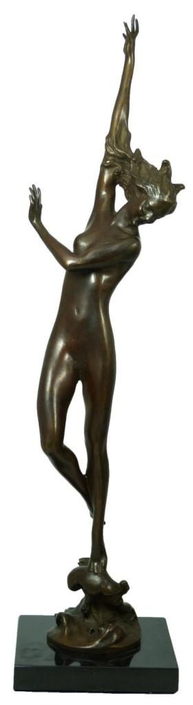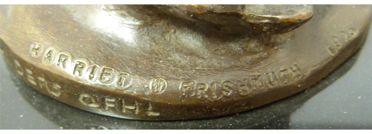 A bronze sculpture titled 'Crest of Wave' after Harriet Whitney Frishmuth (AMERICAN, 1880-1980) depicting a nude female standing on a cresting wave. Signed 'HARRIET W FRISHMUTH' and dated 1925 to base. Also marked 'GORHAM CO. FOUNDERS OFHL'. Mounted on black marble base. Measures 19 3/4" height + 7/8" base height (50.1cm + 2.2cm). Total weight of 4117 grams.