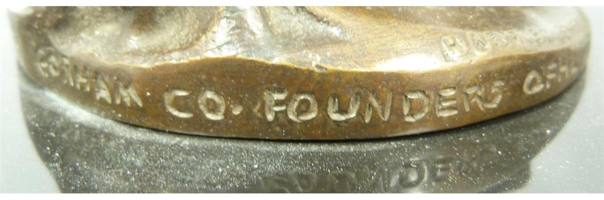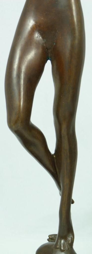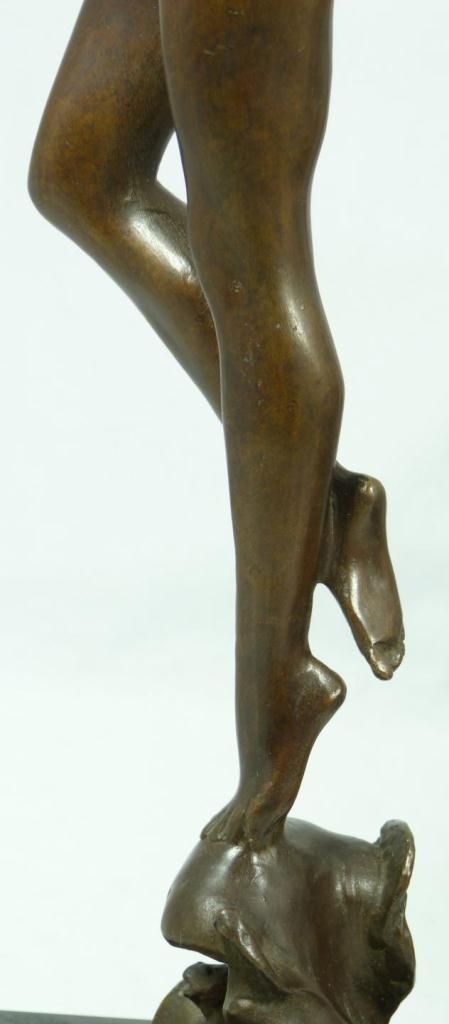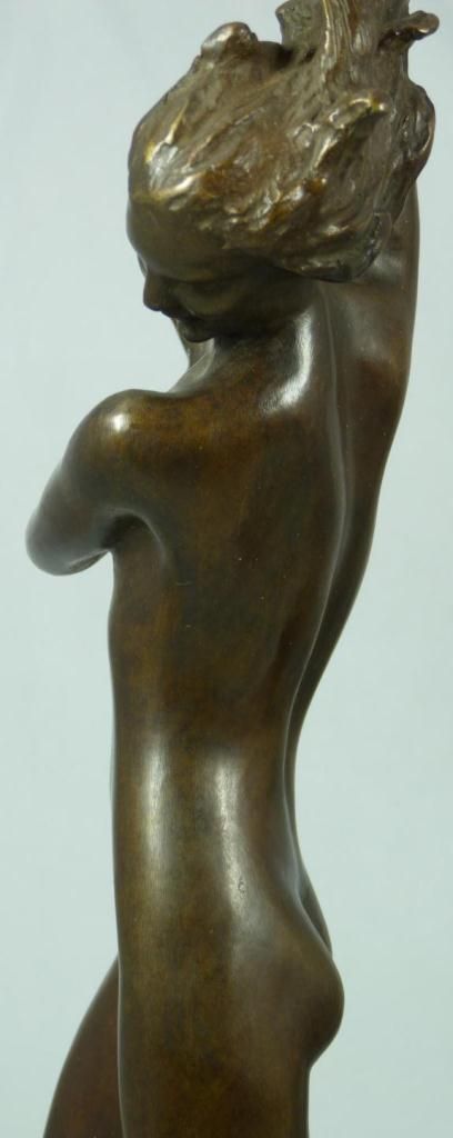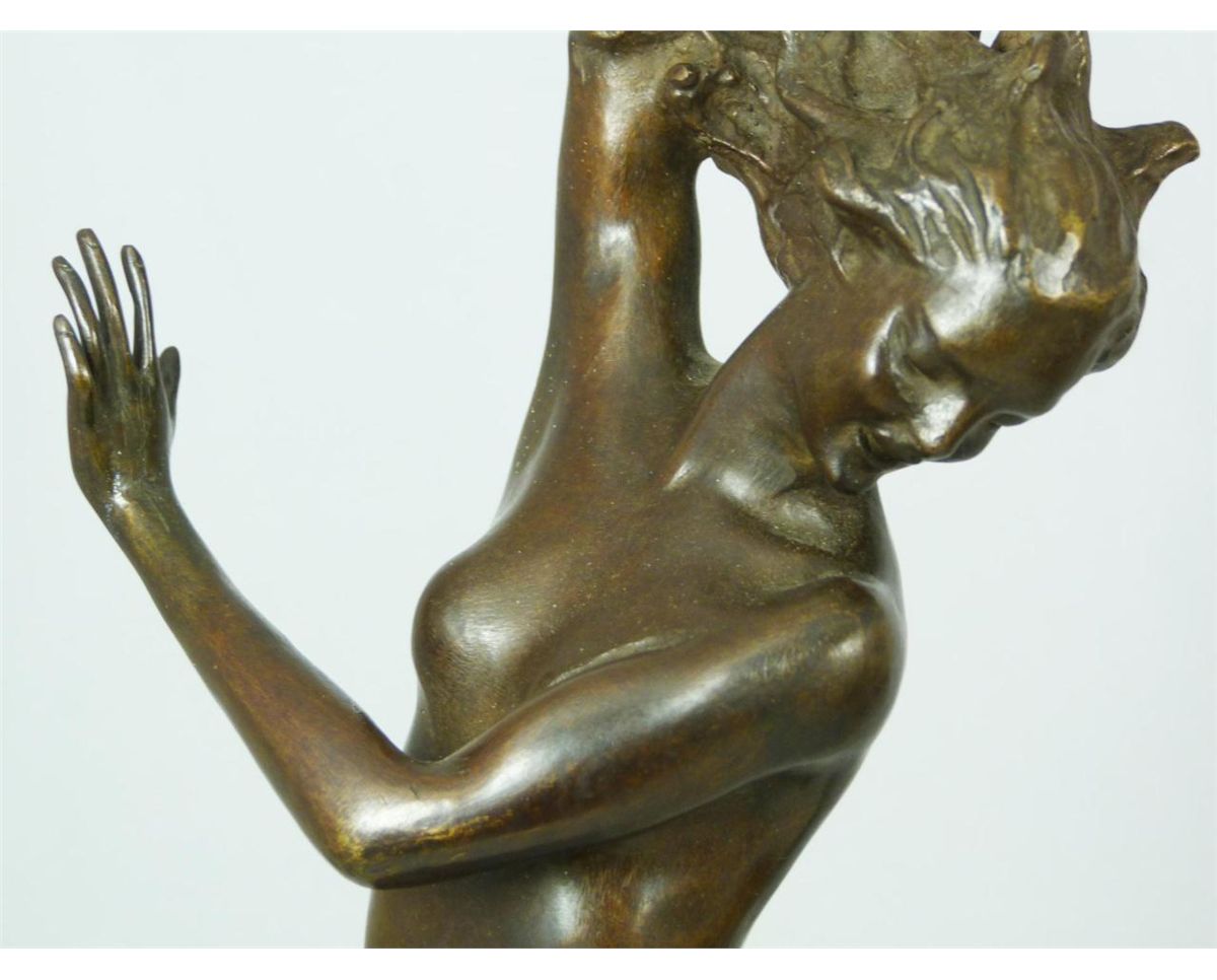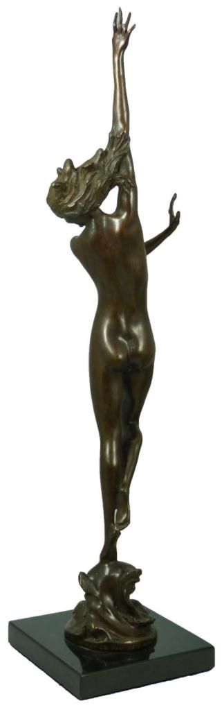 A bronze sculpture titled 'Crest of Wave' after Harriet Whitney Frishmuth (AMERICAN, 1880-1980) depicting a nude female standing on a cresting wave. Signed 'HARRIET W FRISHMUTH' and dated 1925 to base. Also marked 'GORHAM CO. FOUNDERS OFHL'. Mounted on black marble base. Measures 19 3/4" height + 7/8" base height (50.1cm + 2.2cm). Total weight of 4117 grams.