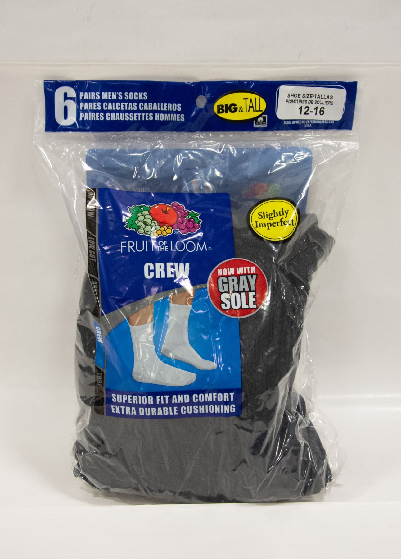 CREW SOCKS BLACK,SIZE 12-16,6 PACK,FRUIT OF THE