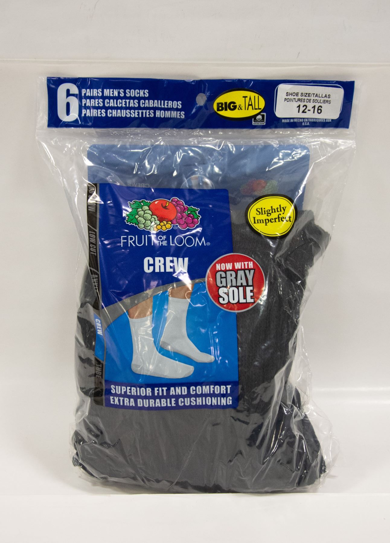 CREW SOCKS BLACK,SIZE 12-16,6 PACK,FRUIT OF THE