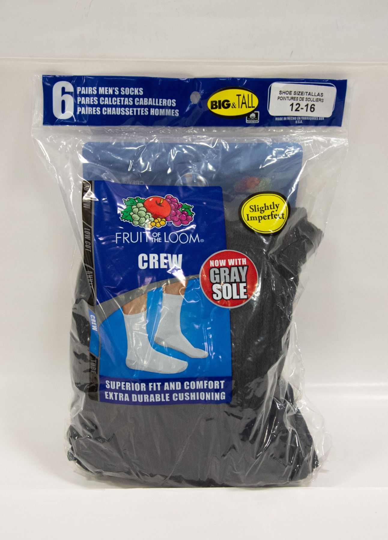 CREW SOCKS BLACK,SIZE 12-16,6 PACK,FRUIT OF THE