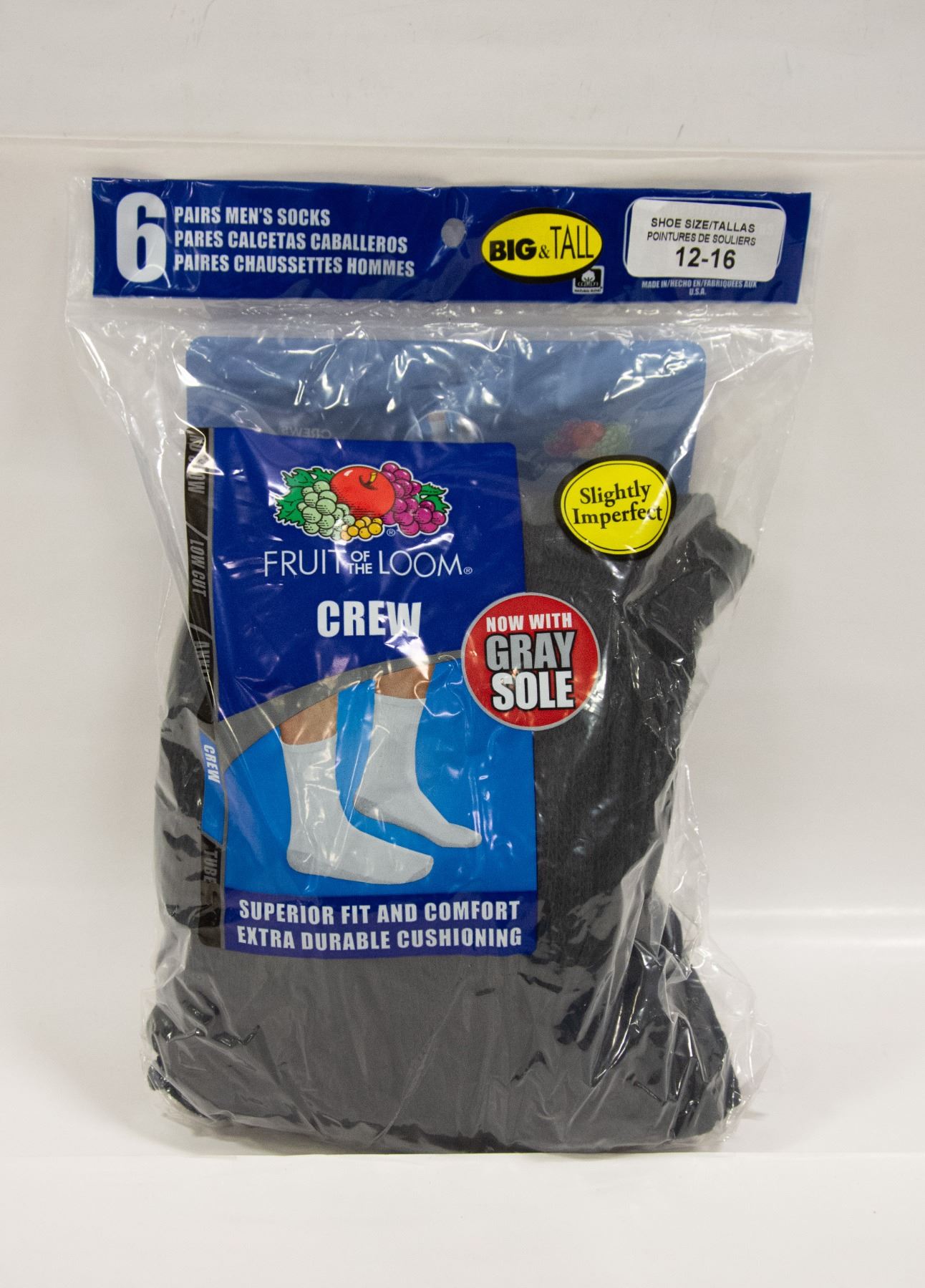 CREW SOCKS BLACK,SIZE 12-16,6 PACK,FRUIT OF THE