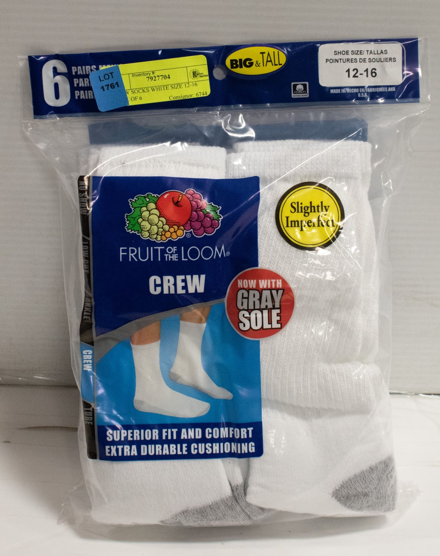 CREW SOCKS WHITE SIZE 12-16 PACK OF 6