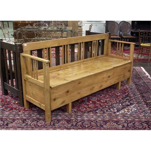 BENCH: Circa 1875 Scandinavian pine long trundle bed bench. 35''h x 22''d x 74''w