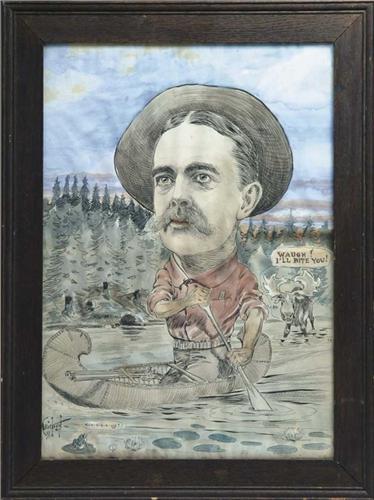 CRICHTON (American, Early 20th Century) “WAUGH I’LL BITE YOU”. Watercolor political cartoon shows a mustachioed Teddy Roosevelt in a canoe paddling along a river with forest in background. A moose is looking on knee deep in water with text bubble “Waugh I’ll Bite You”. A small frog sits on a lily pad with text bubble “Gur-r-r-r-up”. Housed in a period stained oak frame. SIGHT SIZE: 19-1/2” x 13-1/2”. CONDITION: Good, some toning to bottom edge. 9-96665