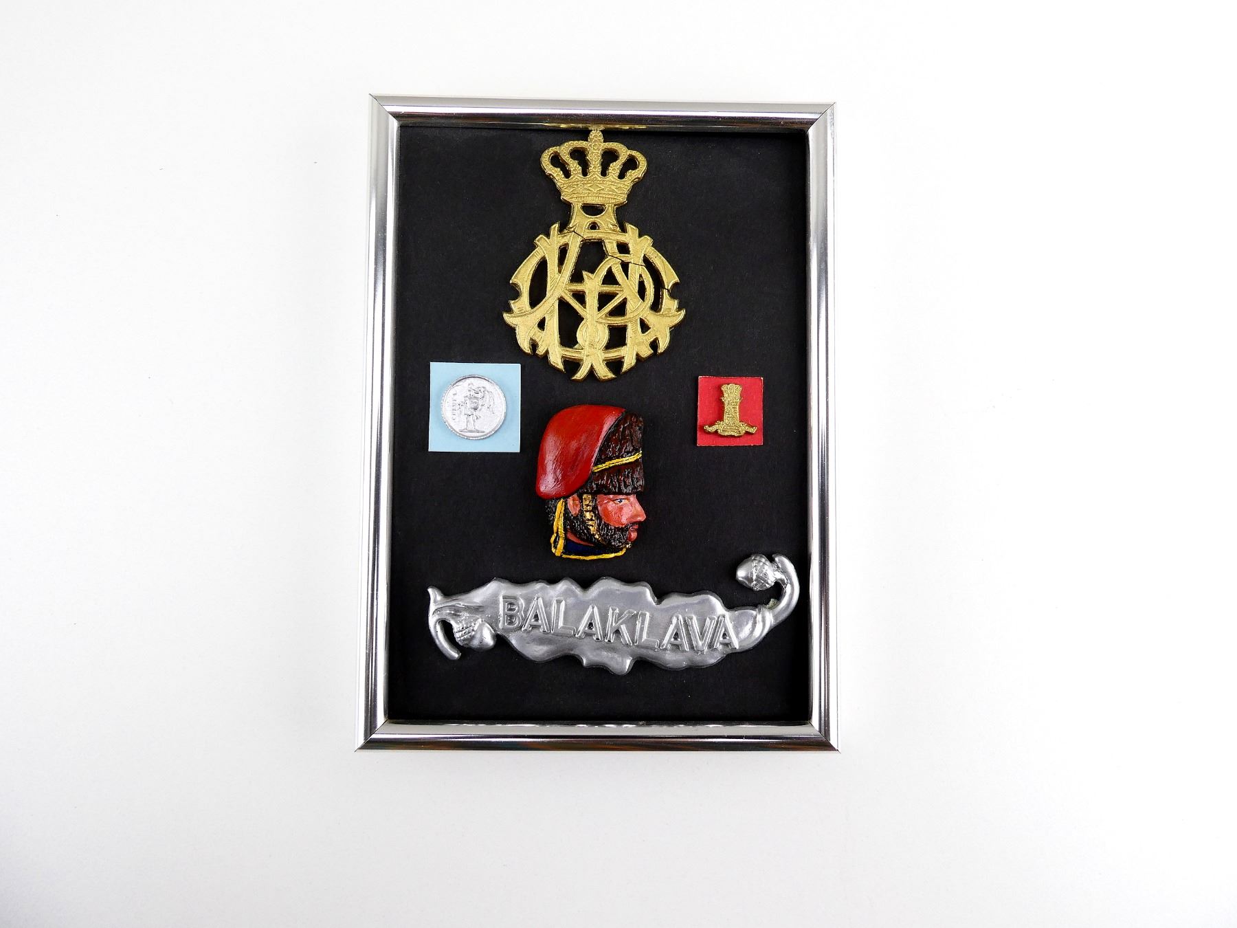 (1) FRAMED RESIN CASTINGS OF BRITISH SOLDIER'S HEAD, BRITISH 1854 CRIMEA MEDAL, "BALAKLAVA" (BATTLE OF BALACLAVA) & WHAT APPEARS TO BE A COUPLE OF BADGES, AFFIXED TO FRAMED BACKING, NO GLASS, FRAME APPROX. 7.5" X 5 3/8". SEE PHOTOS.