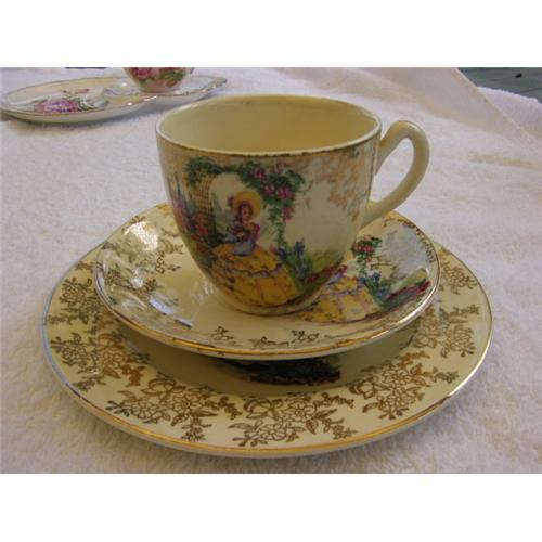 CRINOLINE LADY TRIO. POST STAMP 1936 MADE BY WEATHERBY HANLEY ENGLAND, [FALCON WARE]COLOURS BRIGHT, NO CHIPS/CRACKS ECT: